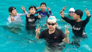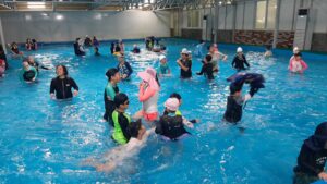 하지만 한창 신나게 놀던 도중 갑자기 비가 내리기 시작했습니다. 아이들은 아쉬운 마음을 잠시 접고, 곧바로 실내 수영장으로 자리를 옮겨 활동을 이어갔습니다. 실내 수영장에서는 잡기 놀이와 릴레이 수영이 펼쳐지며 오히려 더 활기찬 웃음이 퍼졌습니다. 빗속에서도 아이들은 기죽지 않고 더욱 힘차게 뛰어놀며 즐거운 시간을 이어갔습니다.