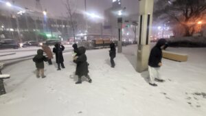 아이들은 곧 눈을 손에 쥐고 살살 뭉치기 시작했습니다. 누군가는 커다란 눈덩이를 만들고, 누군가는 조심스럽게 작은 눈송이를 모았습니다. “얼굴은 안 돼!”라는 약속을 나눈 뒤 시작된 눈싸움은 웃음과 함께 이어졌고, 여기저기서 아이들의 환한 목소리가 겨울밤 거리를 채웠습니다. 눈을 맞고도 웃음이 멈추지 않는 모습에서, 아이들이 느끼는 즐거움이 고스란히 전해졌습니다.