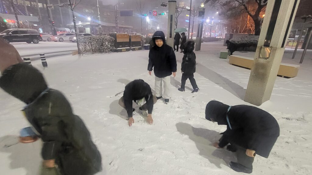 하얀 눈이 소복이 쌓이던 날, 기다리던 첫눈이 드디어 우리 곁으로 찾아왔습니다. 평소보다 훨씬 굵고 많이 내린 눈에 아이들의 발걸음은 자연스럽게 밖으로 향했습니다. 짧은 시간이었지만, 그날의 눈은 아이들에게 오래 기억될 소중한 선물이 되었습니다. 두툼한 외투와  자를 단단히 챙겨 쓰고 밖으로 나선 아이들은 눈앞에 펼쳐진 하얀 세상에 설렘을 감추지 못했습니다. 발을 내딛을 때마다 들려오는 ‘뽀득뽀득’ 눈 밟는 소리에 아이들은 서로를 바라보며 웃음을 터뜨렸고, 그 소리마저 신기한 놀이가 되었습니다. 아이들은 곧 눈을 손에 쥐고 살살 뭉치기 시작했습니다. 누군가는 커다란 눈덩이를 만들고, 누군가는 조심스럽게 작은 눈송이를 모았습니다. “얼굴은 안 돼!”라는 약속을 나눈 뒤 시작된 눈싸움은 웃음과 함께 이어졌고, 여기저기서 아이들의 환한 목소리가 겨울밤 거리를 채웠습니다. 눈을 맞고도 웃음이 멈추지 않는 모습에서, 아이들이 느끼는 즐거움이 고스란히 전해졌습니다. 눈놀이는 단순한 놀이를 넘어 오감으로 겨울을 느끼는 시간이었습니다. 손으로 만져보며 차가움을 느끼고, 눈을 살짝 맛보며 “진짜 물 맛이야!”라며 깔깔 웃기도 했습니다. 눈 위에 남겨진 발자국 하나하나에는 아이들의 호기심과 자유로움이 담겨 있었습니다. 도심 한가운데였지만, 그 순간만큼은 모두가 눈으로 이어진 작은  놀이터 안에 있었습니다. 차가운 공기 속에서도 아이들의 얼굴에는 따뜻한 기운이 가득했고, 서로를 바라보며 자연스럽게 어울리는 모습은 그 자체로 소중한 풍경이었습니다. 잠시의 시간이었지만, 아이들은 눈과 함께 겨울을 온몸으로 느끼고, 친구들과 함께하는 즐거움을 다시 한번 경험했습니다. 이런 평범한 일상 속 순간들이 아이들의 마음에 오래 남아, 훗날 따뜻한 기억으로 떠오르기를 바랍니다. 첫눈이 내리던 날, 아이들은 단순히 눈놀이를 한 것이 아니라 함께 웃고, 느끼고, 추억을 쌓았습니다. 하얀 눈처럼 맑고 소중했던 그날의 시간이 아이들의 성장 속에 조용히 스며들기를 기대해 봅니다.